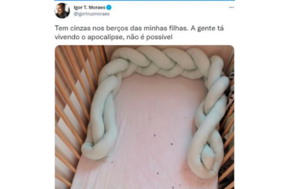 “Tem cinzas nos berços das minhas filhas. A gente tá vivendo o apocalipse, não é possível”, escreveu ele na legenda do post no Twitter. Os internautas ficaram chocados e responderam a publicação do historiador. “Como assim??”, questionou um. “Meu Deus Igor”, escreveu outra.