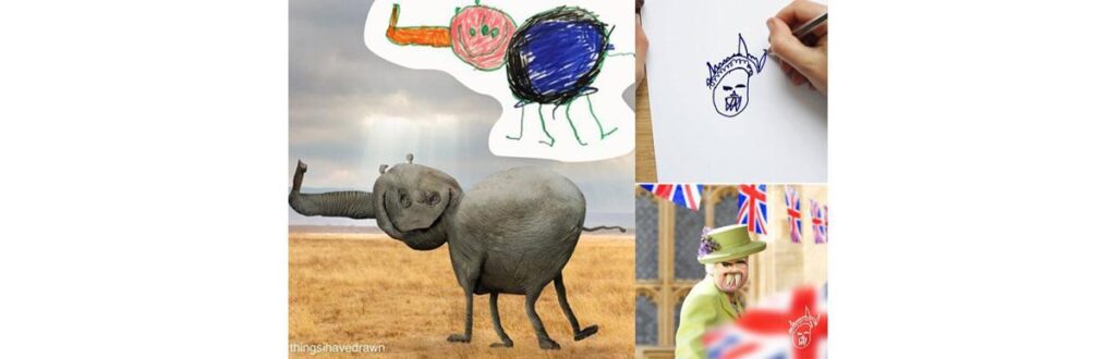 Ele bombou tanto que, além de compartilhar apenas os desenhos dos seus filhos, começou a aceitar obras de arte de crianças de todo o mundo. Nas fotos publicadas, girafas, pássaros, ursos e até mesmo a rainha Elizabeth são modificados digitalmente e transformados nos desenhos das crianças, o que fica um pouco bizarro, mas muito engraçado.