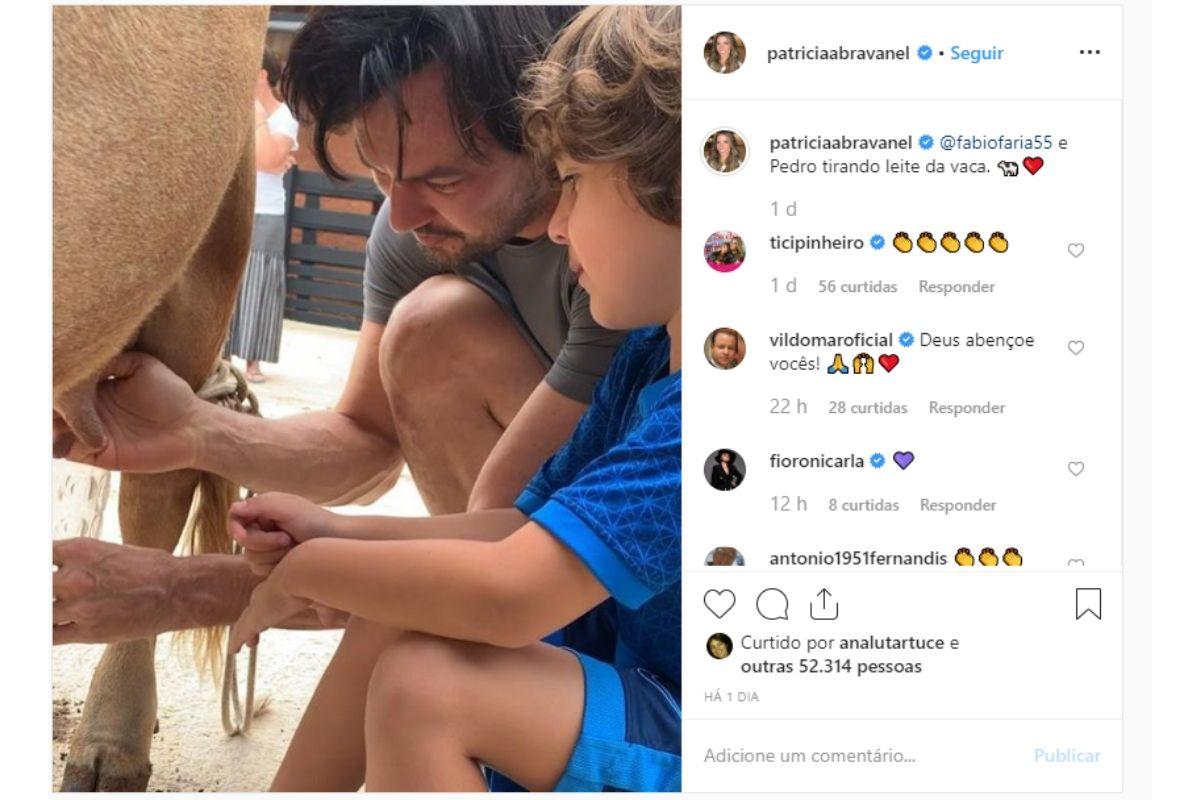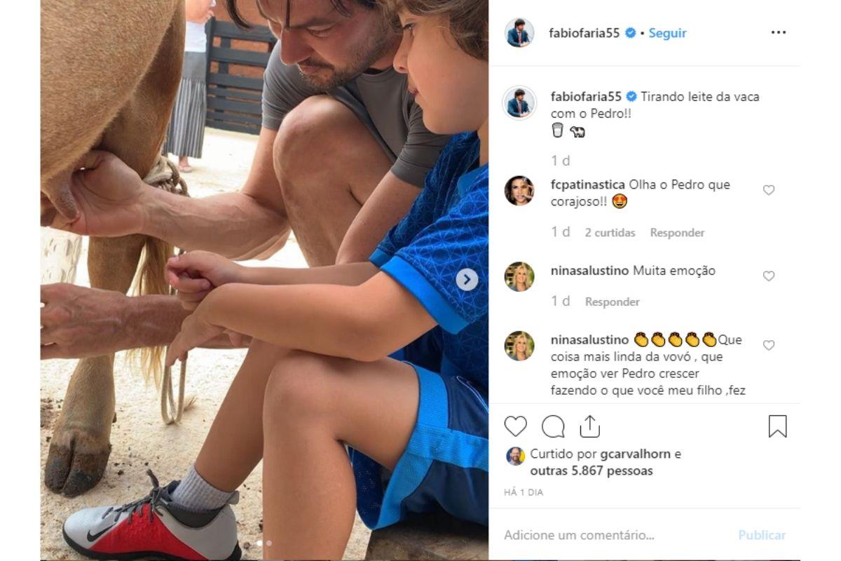 “@fabiofaria55 e Pedro tirando leite da vaca”, escreveu ela. Fábio também publicou a mesma cena. “Tirando leite da vaca com o Pedro!!”, comentou o pai coruja. Nos comentários, todo mundo elogiou a coragem do menino.