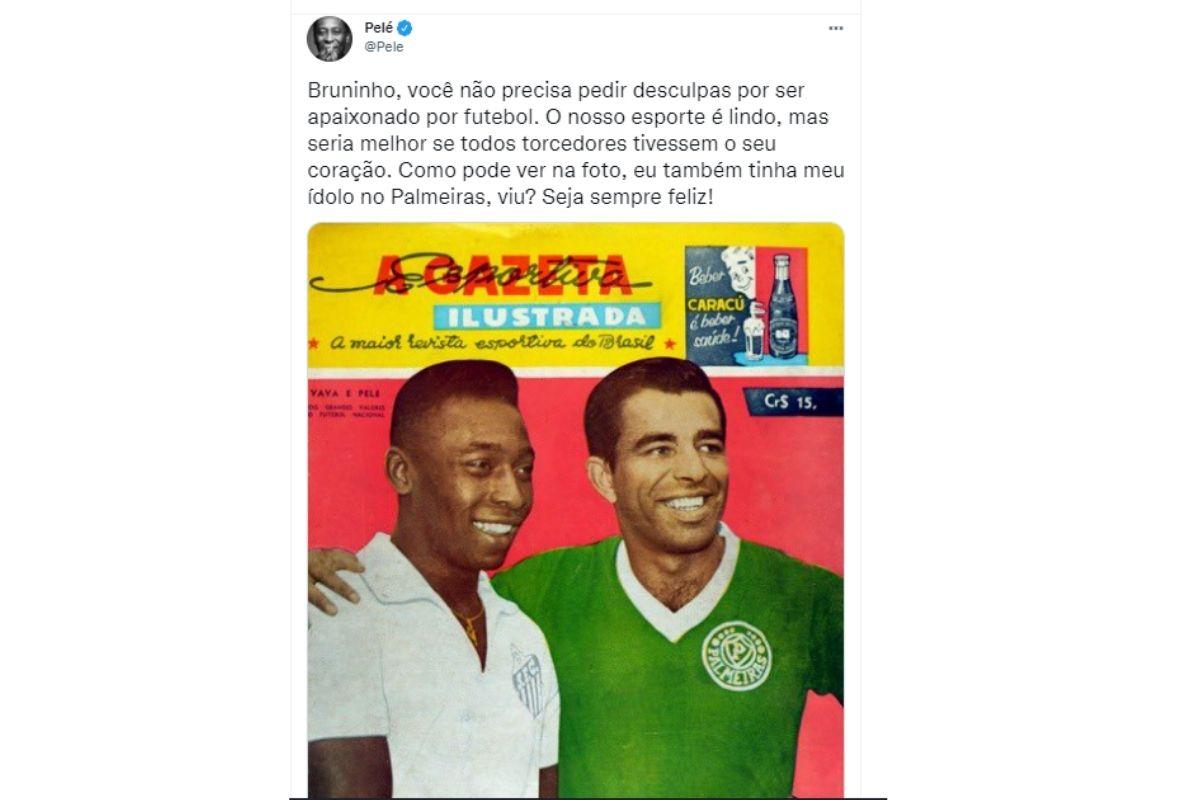 “Bruninho, você não precisa pedir desculpas por ser apaixonado por futebol. O nosso esporte é lindo, mas seria melhor se todos os torcedores tivessem o seu coração. Como pode ver na foto, eu também tinha meu ídolo no Palmeiras, viu? Seja sempre feliz!”, escreveu ele, no Twitter.