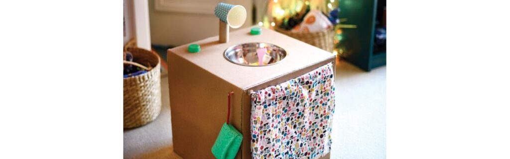 Tem coisa mais gostosa na infância que brincar de faz de conta? Aqui em casa qualquer caixa é pretexto pra gente se esbaldar! Recebemos uma encomenda pelo correio e decidimos reaproveitar para fazer uma pia de papelão!