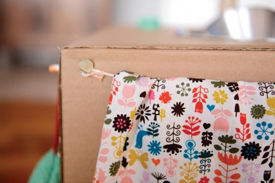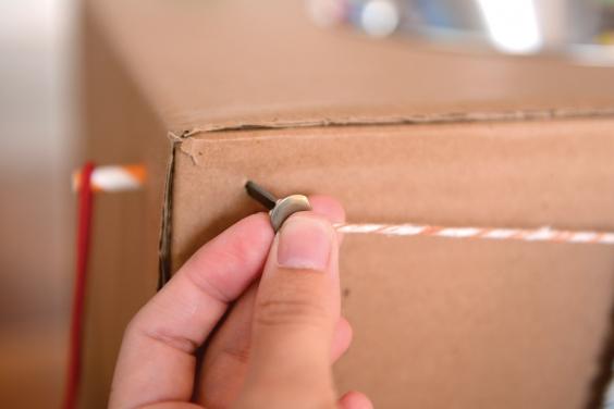 Para fazer a cortininha, amarre uma ponta de barbante em um dos colchetes e faça um furo em uma extremidade da caixa. Encaixe o colchete e estique, tensionado bem o barbante até a outra ponta.