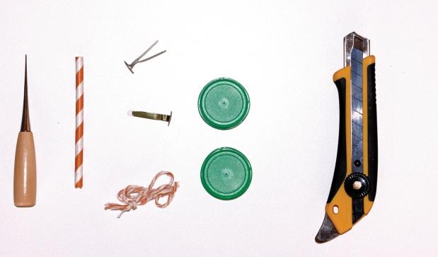 Você também vai precisar de: 1 canudo de papel • 1 pedaço de tecido estampado • barbante • 2 colchetes de papelaria • 1 esponja • cola quente • tesoura • estilete