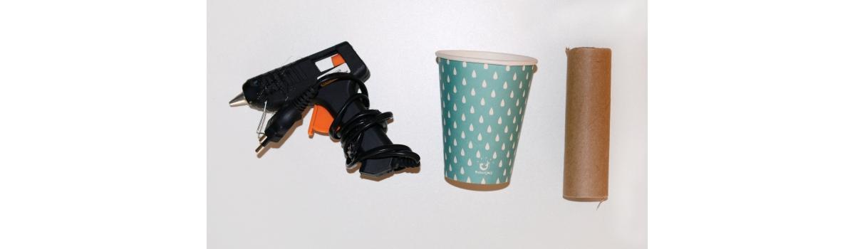 Você vai precisar de: papelão • 1 tubo de papelão que vem no rolo de papel-toalha ou papel higiênico • 1 copinho descartável decorado • 2 tampinhas descartáveis • 1 recipiente de inox para ser a cuba da pia