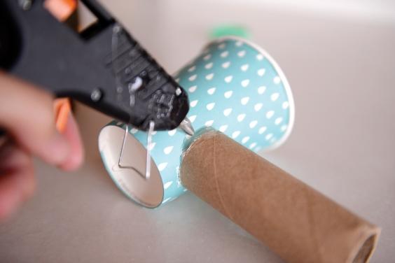 Posicione a cuba e o tubo de papelão nos furos. Cole as duas tampas plásticas para serem os misturadores da torneira, passando cola quente na superfície. Para fazer a torneira, cole o tubo de papelão em um copo descartável.
