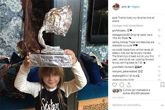 Quem levou para casa foi a cantora Ariana Grande. Mas sem tristeza! Quando Pink voltou para sua casa depois da noite de premiação, ela ganhou um prêmio muito melhor: um Grammy feito à mão pela filha, Willow, de 7 anos, pelo filho, Jameson, de 2 anos!
