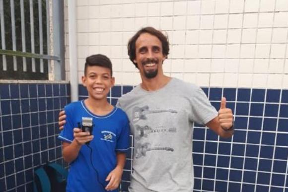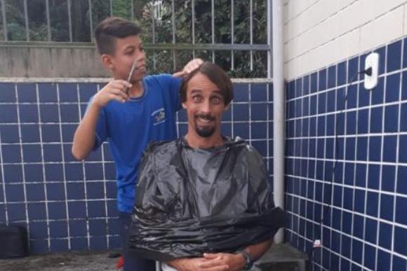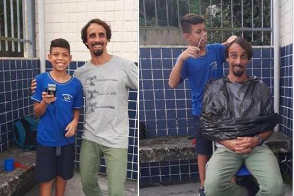 “Na foto estamos rindo, mas, na verdade, a gente estava supernervoso! Foi tudo improvisado, saco de lixo, tesoura cega rangendo, o pessoal colocando pilha. Estávamos os dois com medo. Acabou que ele só tirou as pontas mesmo (risos) — contou o professor ao Só Notícia Boa. O post viralizou na internet e chegou as 72 mil curtidas e aos 2 mil compartilhamentos.