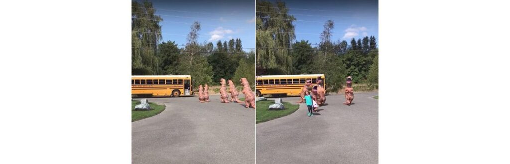 Imagina voltar da escola e encontrar sua família inteira vestida de T-rex esperando você chegar? Incrível, né? Mas algumas crianças têm vergonha, assim como a menina do vídeo que não perdeu tempo e saiu correndo! O vídeo destes pais de Orting, Washington, aguardando a filha mais velha voltar do colégio tomou conta da internet e já alcançou mais de 6 milhões de visualizações.