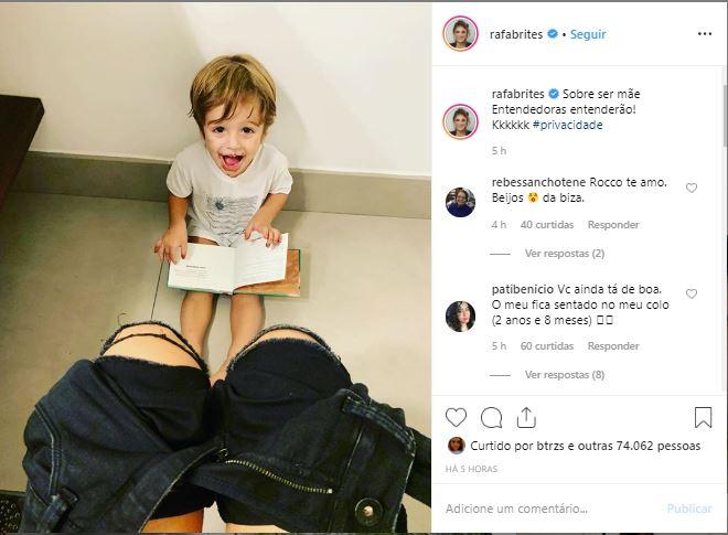 Em seu Instagram, a apresentadora postou uma foto sentada na privada e do filho sentado na sua frente, fazendo companhia.
