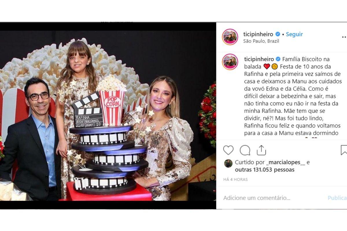 A apresentadora usou as redes sociais para compartilhar cada detalhe da festa e também para fazer um textão. Ela explicou que Manuella ficou com a avó e com a babá enquanto a família biscoito curtia festa. “Festa de 10 anos da Rafinha e pela primeira vez saímos de casa e deixamos a Manu aos cuidados da vovó Edna e da Célia“, começa.