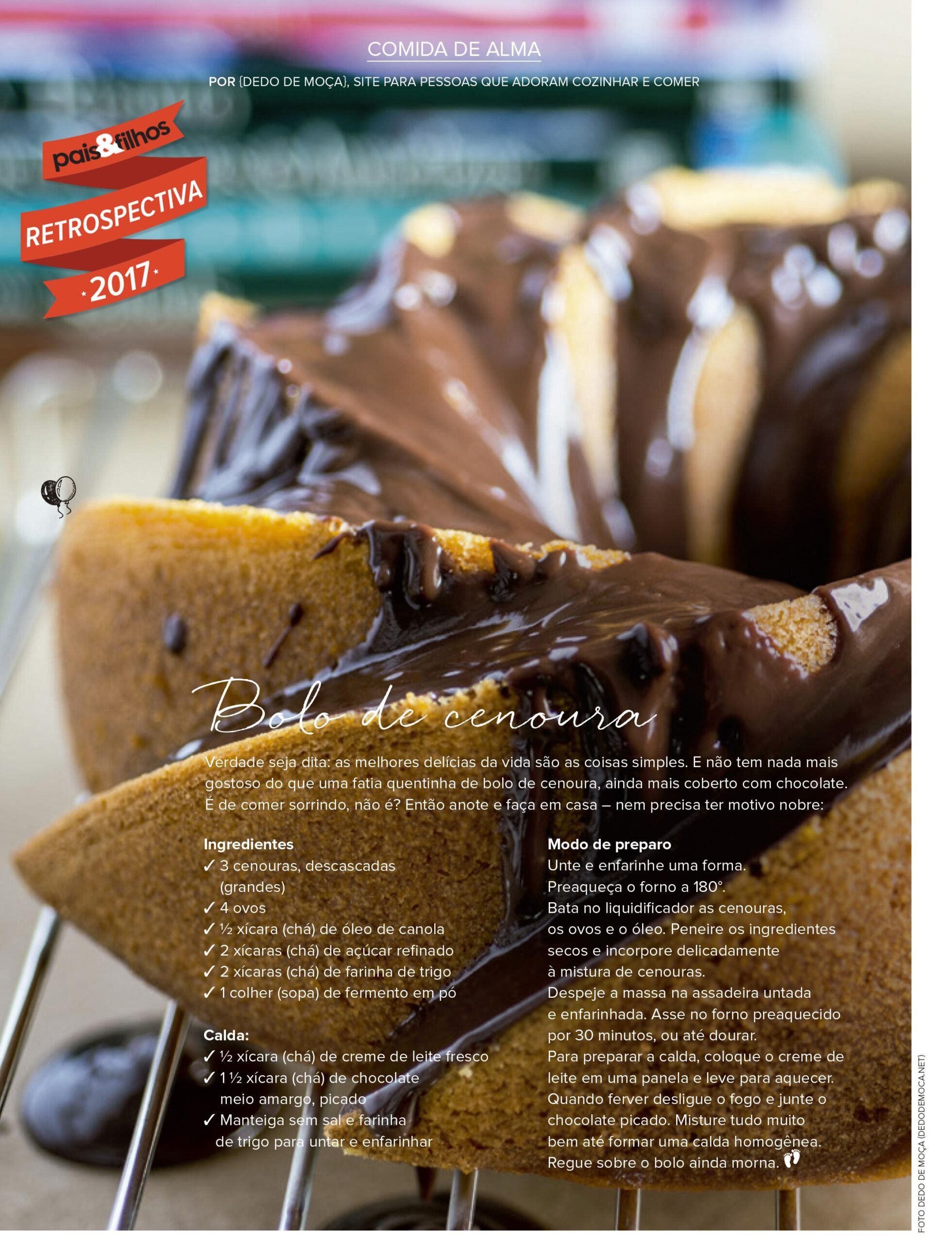 O site Dedo de Moça colabora para cada edição da nossa revista com uma receita deliciosa. Na hora de selecionar uma para a retrospectiva foi unanime: bolo de cenoura!