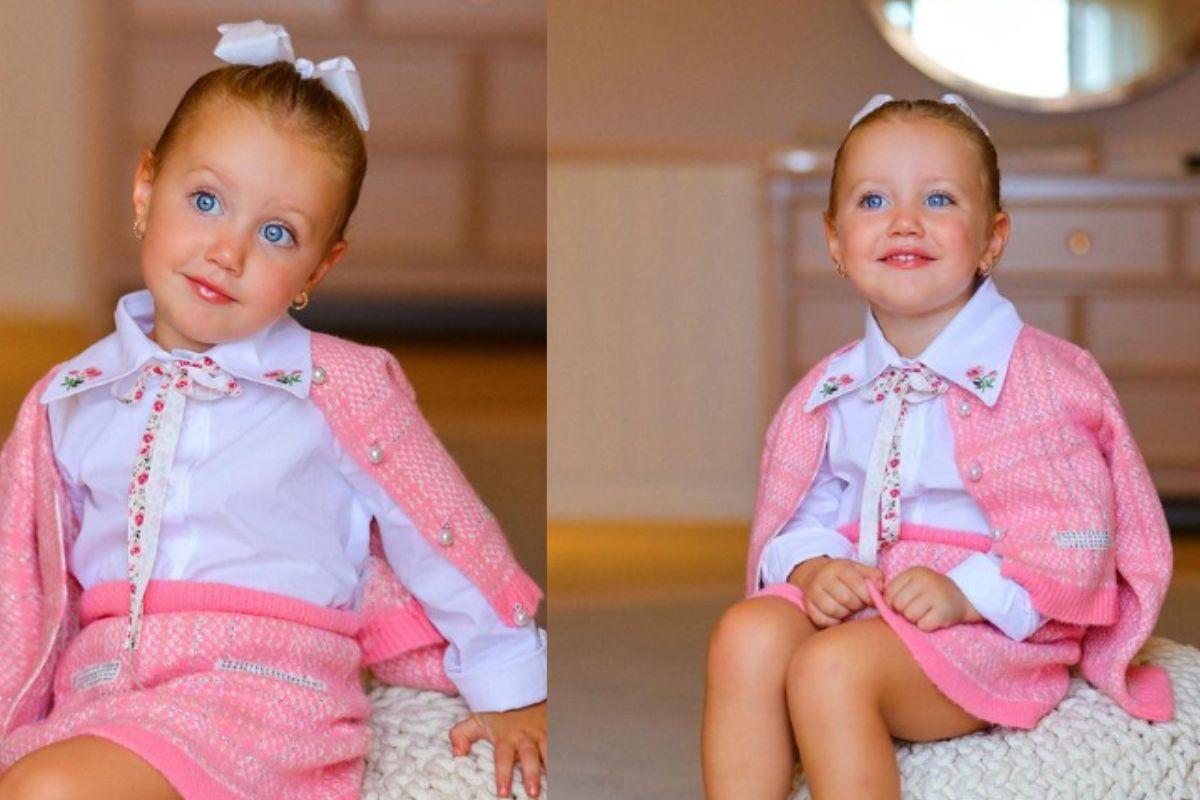 Nas imagens a menina aparece usando uma camisa branco junto com um conjunto rosa de saia e blazer.’’Minha princesinha, a cara da mamãe (pelo menos os olhos são do papai)! Kkk’’, escreveu o pai na legenda.