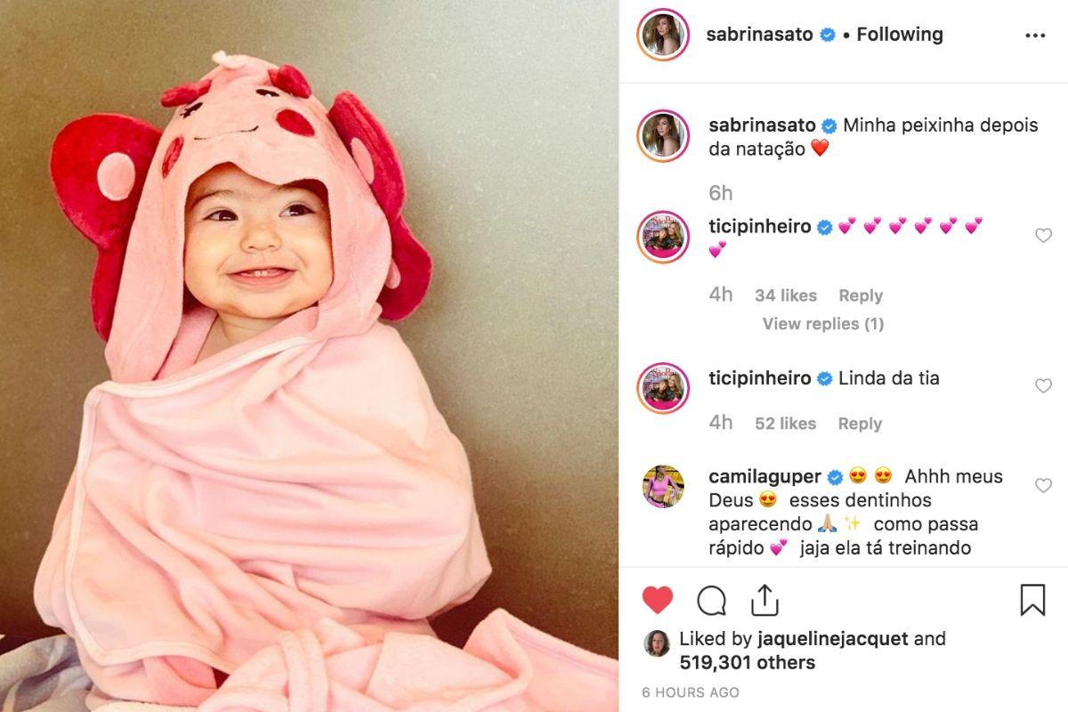 Em publicação, a menina aparece enrolada na toalha com um sorriso de orelha a orelha. “Minha peixinha depois da natação”, escreveu a apresentadora em legenda.