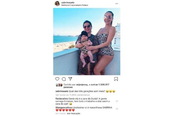 Ao lado da família, todas combinando com maiôs estampados de onça, ela perguntou: “Qual das três gerações sorri mais?”. Os seguidores de Sabrina não perderam tempo e decidiram: “A Zoe!”.