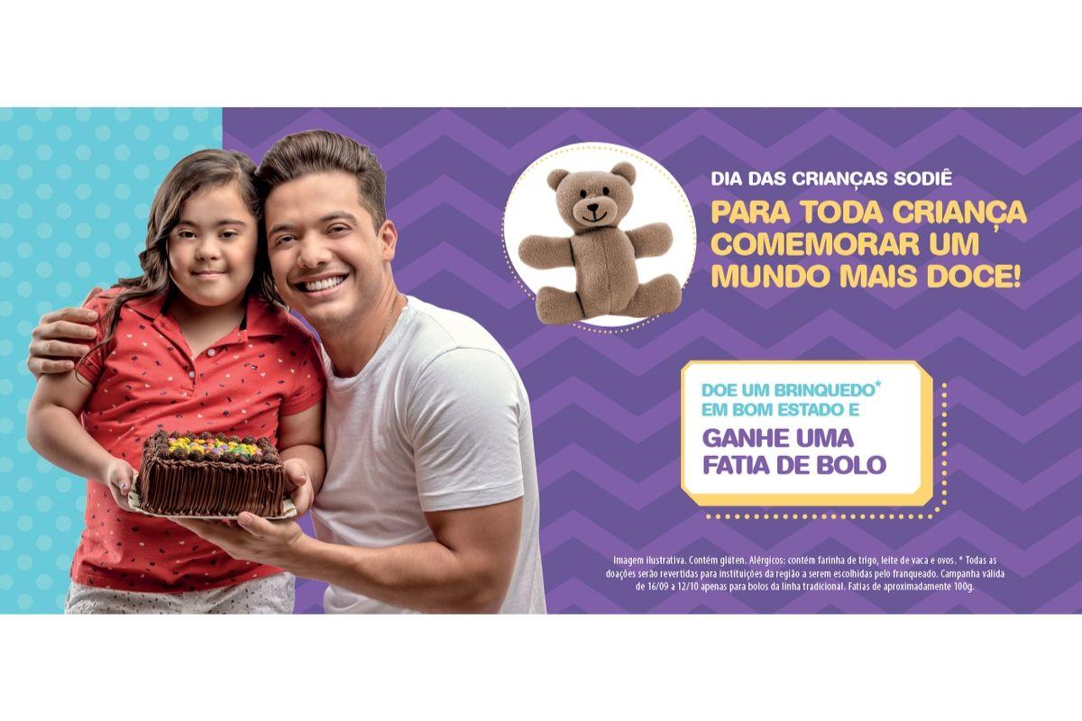 Todos os brinquedos arrecadados serão doados à instituições de caridade, que serão escolhidas por cada unidade Sodiê. A ação vale para as 314 lojas espalhadas pelo país e os objetos poderão ser recebidos até 12 de outubro. A campanha tem como imagem de divulgação Sofia, filha da fundadora da Sodiê, ao lado do cantor Wesley Safadão, e traz o slogan “para toda criança comemorar um mundo mais doce”.