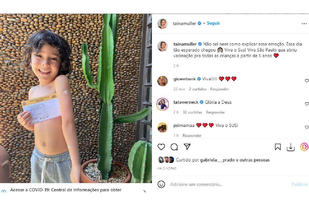 No Instagram, ela compartilhou uma foto do menino sorrindo com o comprovante de vacinação na mão e o curativo da vacinação no braço. Na legenda, escreveu: “Não sei nem como explicar essa emoção. Essa dia tão esperado chegou. Viva o Sus! Viva São Paulo que abriu vacinação pra todas as crianças a partir de 5 anos”.