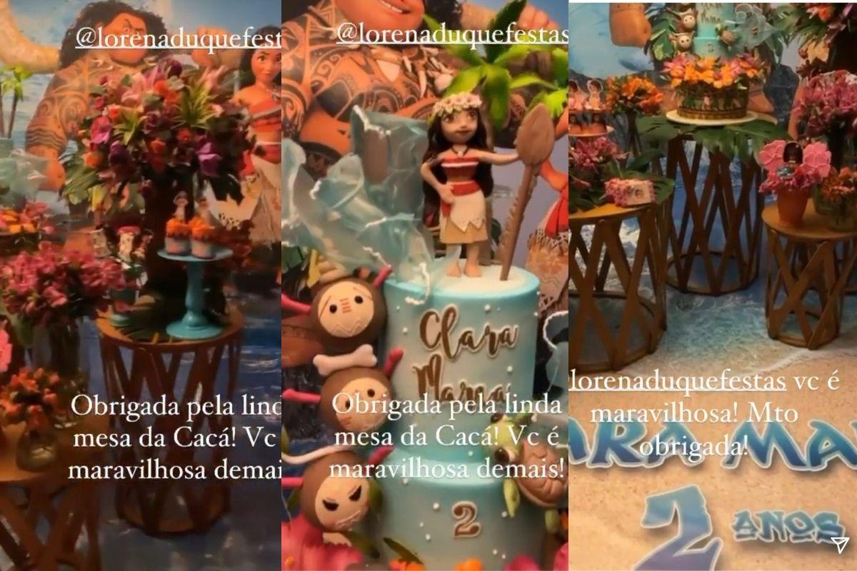Lorena Duque foi a responsável pelo visual do local. O tema principal foi do filme de animação da Disney, “Moana”. Nos vídeos, é possível ver a mesa de doces e a linda decoração do bolo de aniversário da pequena Clara Maria.