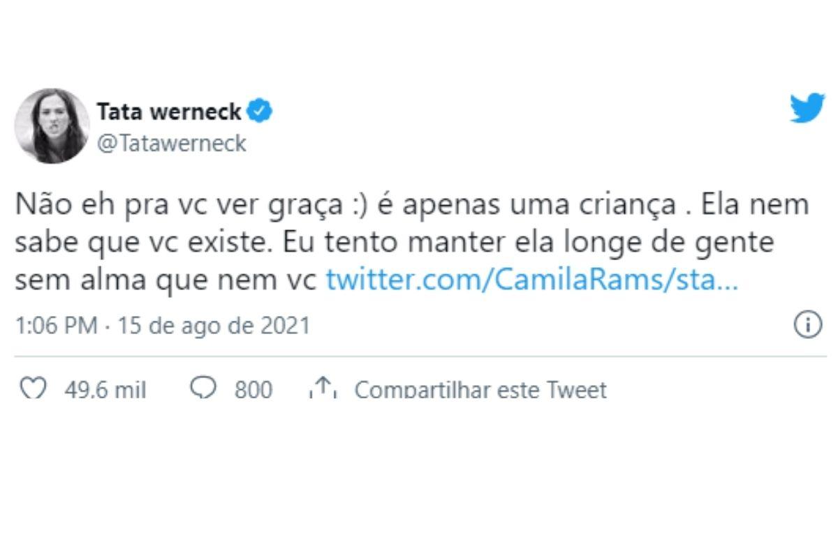 Tatá Werneck respondeu críticas de um seguidor com relação a exposição de Clara Maria nas redes sociais. No Twitter, um internauta declarou, “Devo estar morta por dentro porque não vejo a menor graça nessa Clara Maria” – e foi prontamente respondido pela mãe da menina.