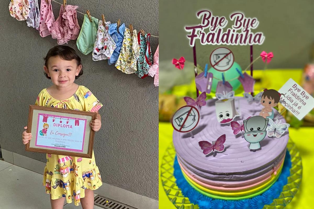A família de Lídia Maria, de 3 anos, resolveu realizar uma festa para a criança pela comemoração da chegada do desfralde! O evento aconteceu em Campo Grande, capital do Mato Grosso do Sul. Tendo convites, decoração, varal de calcinhas novas, bolo, parabéns ‘adaptado’ e lembrancinhas temáticas, a família se divertiu ao lado da mais nova.