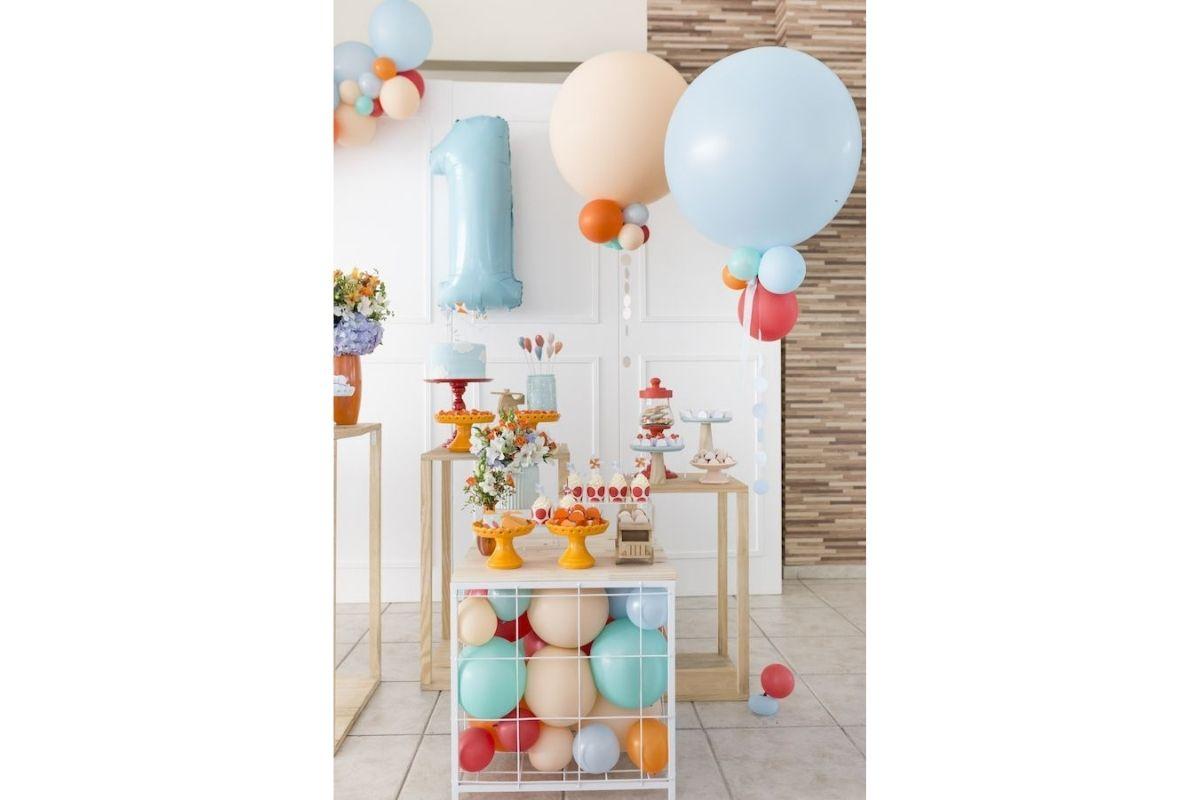 Os balões fazem parte das coisas que têm cara de aniversário, é bem difícil desvincular a imagem deles de uma bela comemoração. Então, por que não abraçar isso e tornar eles o tema da festa e decoração principal do aniversário de 1 ano do seu filho? Vale apostar em várias cores diferentes para deixar o ambiente mais colorido e incorporar esse elemento em outros lugares, como o próprio bolo de aniversário. A gente garante uma celebração divertida e autêntica!
