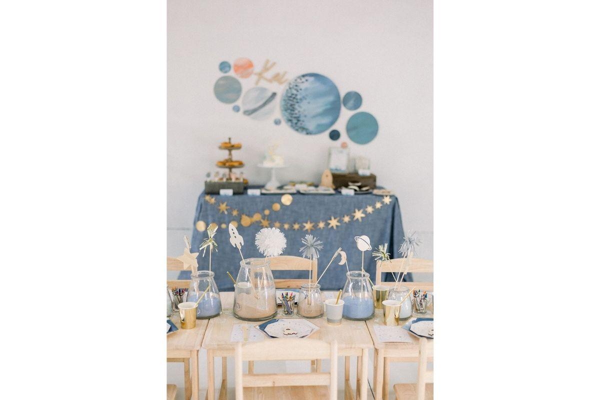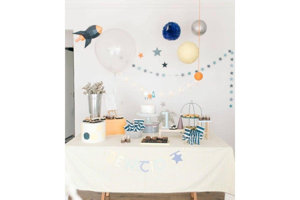 Caso você prefira colocar mais detalhes ao longo do aniversário de 1 ano do seu filho, e não somente na mesa do bolo, foque sua atenção na mesa dos convidados: aqui nessa referência, os jarrinhos de vidro com areia e as ilustrações de foguete fez toda a diferença e, ainda que seja tudo muito simples, deixou a decoração linda e charmosa. É como diz o ditado: Deus mora nos detalhes.