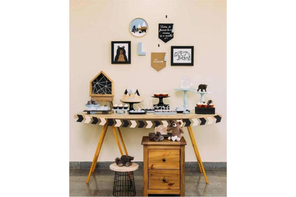 Se você não curte usar muitas cores e prefere optar por um estilo mais minimalista de decoração para a festa do seu filho, essa referência é perfeita para você. Aqui, o principal tom é o preto, que casa com elementos em madeira crua. O tema do aniversário de 1 ano foi “urso”, que está presente em vários detalhes ao redor da mesa do bolo (como em quadrinhos na parede) e na própria mesa, com brinquedos de pelúcia.