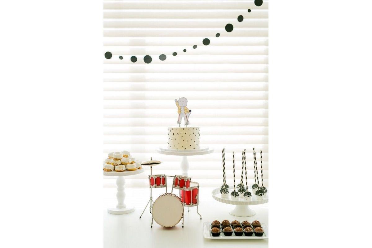 Se você e seu companheiro (ou companheira) são fãs de um determinado cantor ou tipo de música, não tem nada mais criativo do que escolher esse gosto em comum para ser o tema do aniversário de 1 ano do seu filho. Aqui, a família escolheu a banda Queen e o cantor Fred Mercury para decorarem a festa da criança – o bonequinho de papel em cima do bolo fez toda a diferença e deu um charme a mais.