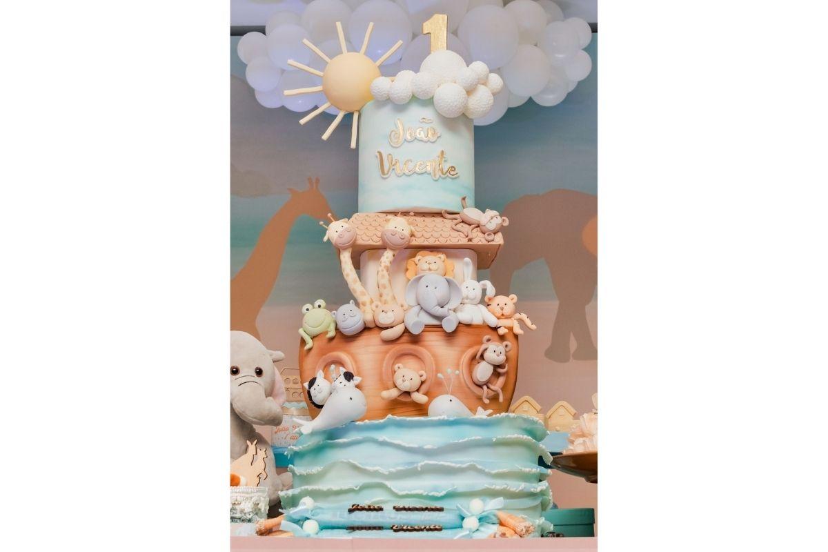 Para as famílias que gostam da história da Arca de Noé e de referências bíblicas, o aniversário de 1 ano do seu filho é a ocasião perfeita para colocar a imaginação na roda e criar uma decoração linda e cheia de elementos que fazem referência à história. A estrela dessa referência é o bolo, que tem vários andares e traz a água, o sol, as nuvens e a arca com os animais escolhidos.