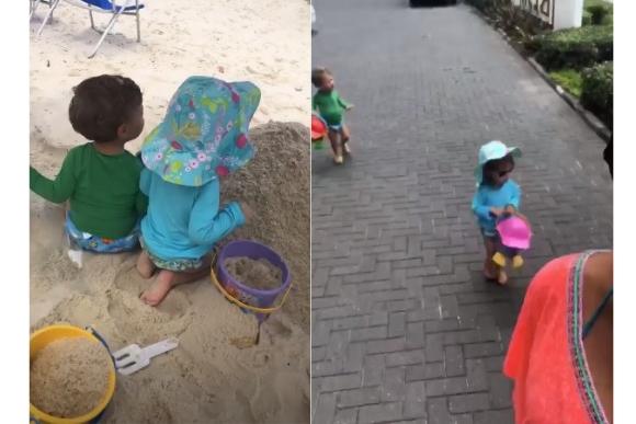 Podemos ver Melinda e Teodoro se divertindo com baldinhos de areia na proteção de um guarda-sol. A mais velha ainda usa um chapéu para não se queimar no forte sol carioca.