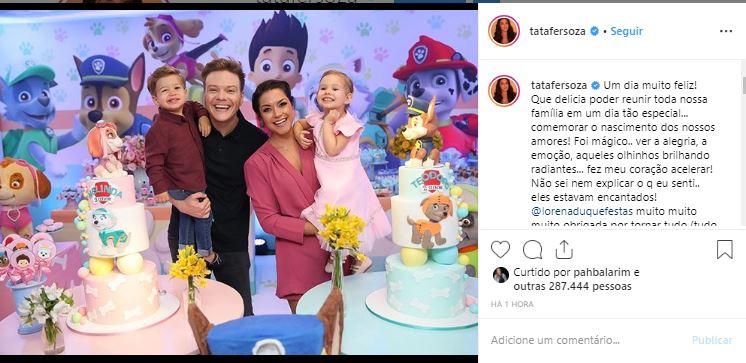 No perfil, Thais publicou uma foto ao lado dos filhos e do marido e escreveu na legenda: “Um dia muito feliz! Que delícia poder reunir toda nossa família em um dia tão especial… Comemorar o nascimento dos nossos amores! Foi mágico ver a alegria, a emoção, aqueles olhinhos brilhando radiantes… Fez meu coração acelerar! Não sei nem explicar o que eu senti, eles estavam encantados”.