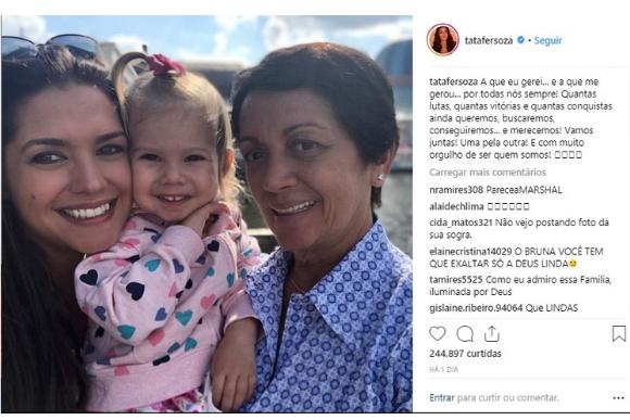 Em sua conta no Instagram, Tata compartilhou uma foto que aparece ao lado da filha e da mãe. Na legenda, ela escreveu: “A que eu gerei… e a que me gerou… por todas nós sempre! Quantas lutas, quantas vitórias e quantas conquistas ainda queremos, buscaremos, conseguiremos… e merecemos! Vamos juntas! Uma pela outra! E com muito orgulho de ser quem somos!”.