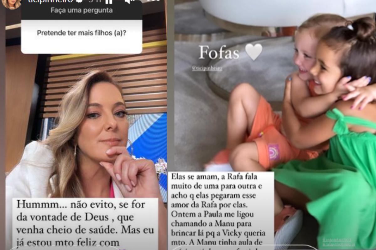 Além disso, ela também foi questionada por uma internauta se ela pretende ter mais filhos no futuro. ”Humm, não evito se for da vontade de Deus, que venha cheio de saúde. Mas já estou muito feliz com as minhas meninas”, respondeu Ticiane nos Stories.