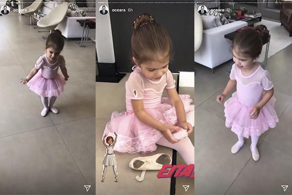 A menina, ao voltar da sua aula de dança, mostrou todos os passos e novidades que aprendeu no dia. Em seu perfil oficial no Instagram, ela agradeceu a “Tia Eli” (Eliane Sampaio) pela roupa cor de rosa e faz pose de bailarina.