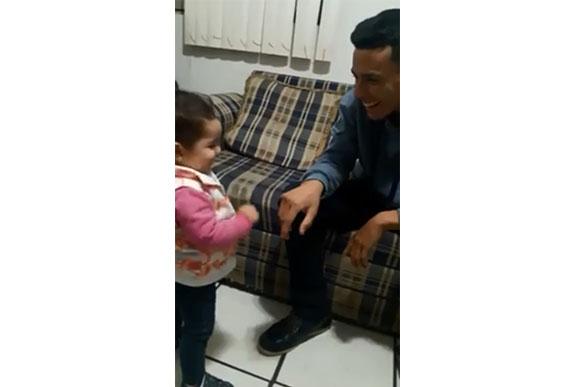 A menina, mesmo tão nova, já deve entende a limitação do pai e tentou arriscar uma linguagem de sinais para conversar com ele. Com as mãos, ela faz gestos para chamar a atenção do pai e começa a gesticular como se soubesse mesmo falar em libras. Mesmo que eles ainda não tenham significado, o pai só sabe sorrir de orgulho da menina.