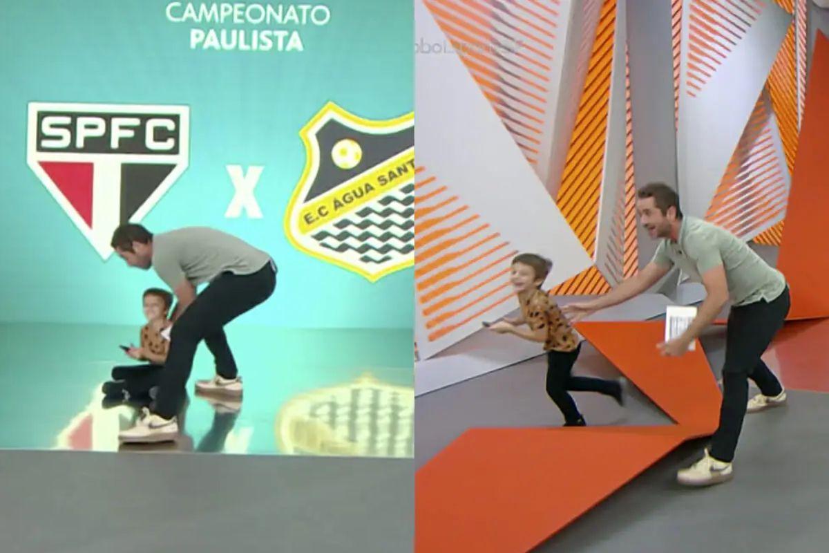 Que susto, hein? Durante a transmissão ao vivo do programa Globo Esporte, da TV Globo, o jornalista Felipe Andreoli, de 43 anos, recebeu uma surpresa após ter começado a apresentar o quadro: seu filho mais velho, Rocco, ‘invadiu’ o estúdio enquanto o pai chamava uma matéria e o momento fez a internet rachar de rir.