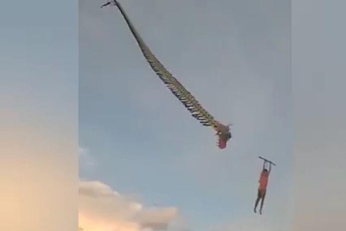 Na Indonésia, um menino de 12 anos, foi levantado no ar após se enroscar nas linhas de uma pipa em forma de dragão. O garoto caiu de cabeça após ficar mais de 30 pés do chão. O vídeo mostra o momento terrível em que a criança é levantada do chão, na frente de várias pessoas que ficam horrorizadas com a cena.