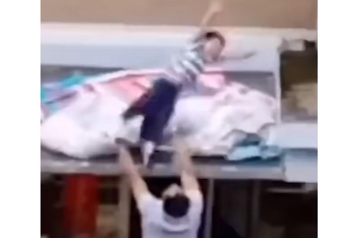 Um homem estava no apartamento onde mora, na China, quando olhou para cima e viu uma criança pendurada no ar condicionado da varanda. Desesperado com a situação, o morador se preparou para ajudar o garoto, que estava prestes a cair. Um vídeo, que tem circulado nas redes sociais, mostra o momento exato que a criança cai e a reação do vizinho do apartamento de baixo.