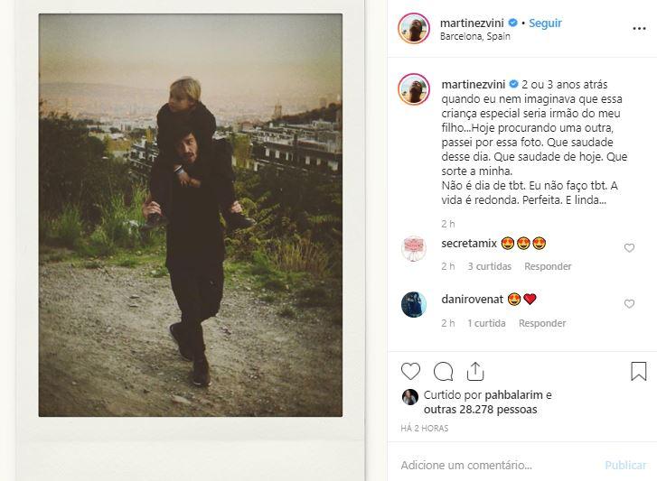 “2 ou 3 anos atrás quando eu nem imaginava que essa criança especial seria irmão do meu filho… Hoje, procurando uma outra, passei por essa foto. Que saudade desse dia. Que saudade de hoje. Que sorte a minha. Não é dia de tbt. Eu não faço tbt. A vida é redonda. Perfeita. E linda…”, disse Vinícius na legenda da publicação.