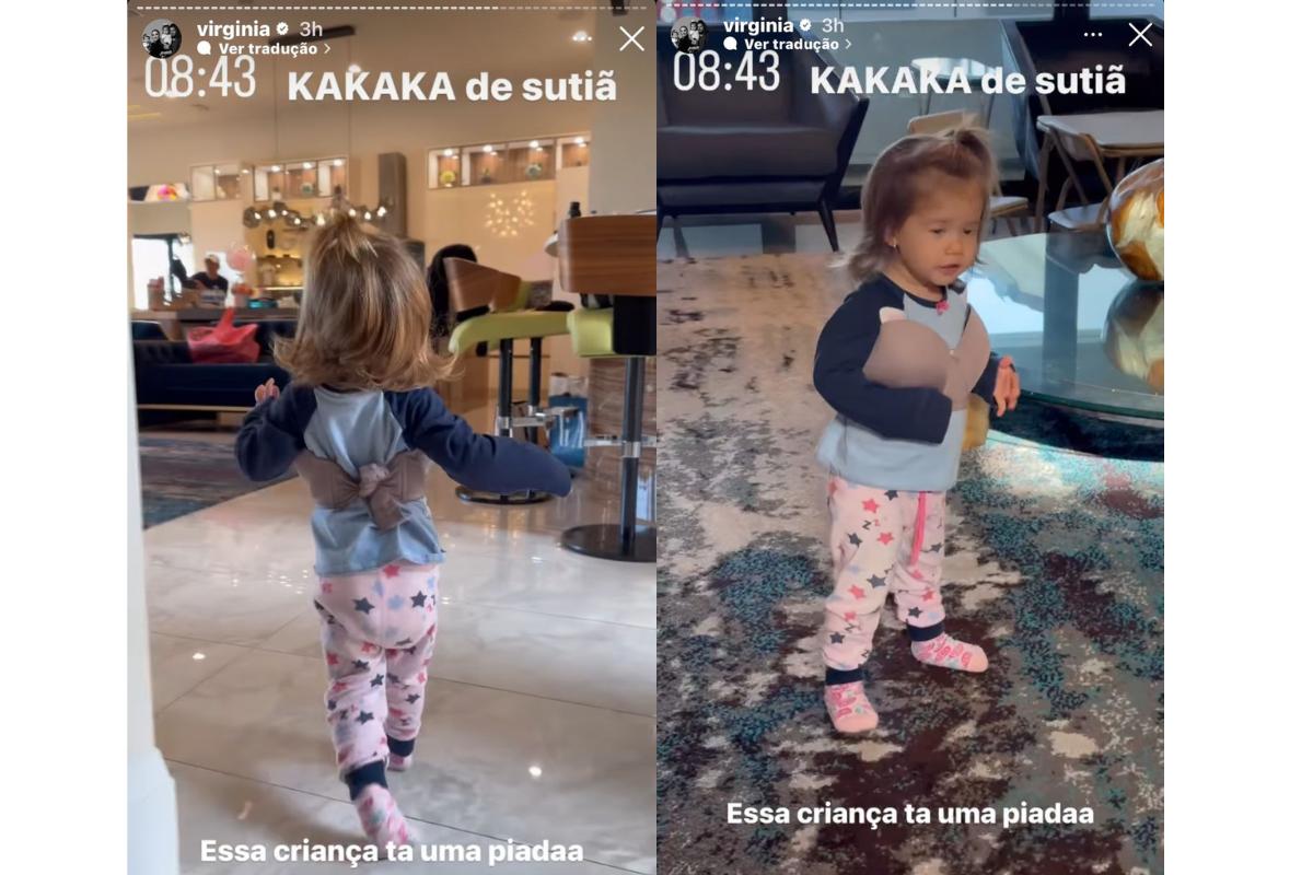 Nessa sexta-feira, dia 10 de março, a influenciadora Virginia Fonseca, postou um vídeo nos Stories do Instagram em que a filha mais velha, Maria Alice, aparece correndo pela casa da família em Orlando com um sutiã da mãe. No registro feito, a empresária escreveu: “De sutiã. Essa criança tá uma piada”. Com muita simpatia, a menina aparece com a peça amarrada no corpo, por ser muito grande, e quando a mãe pede para a criança olhar para o vídeo, ela faz “Xiss”, com maior sorrisão.