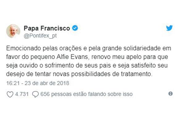 A batalha não acabou e os pais continuam lutando na Justiça para ter o direito de levar o filho para um hospital em Roma, na Itália, que se ofereceu para tratar o bebê. Essa opção surgiu após uma campanha que mobilizou o país e chegou até o papa Francisco que se demonstrou apoio para a família de Alfie através de uma mensagem no Twitter. Estamos na torcida, Alfie!