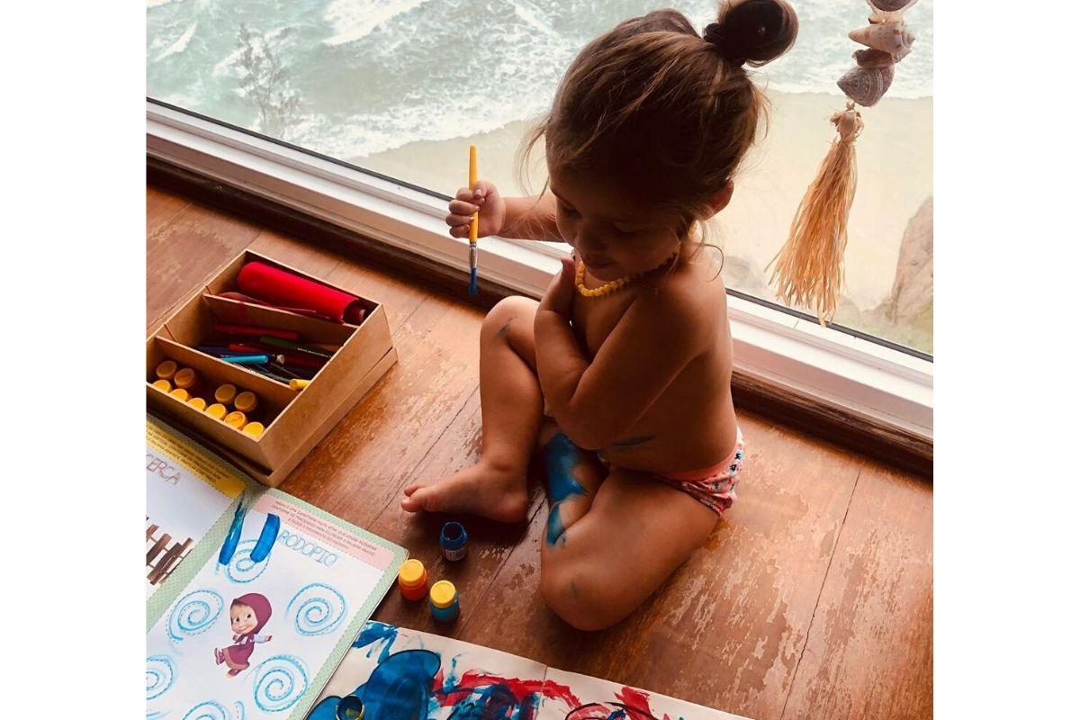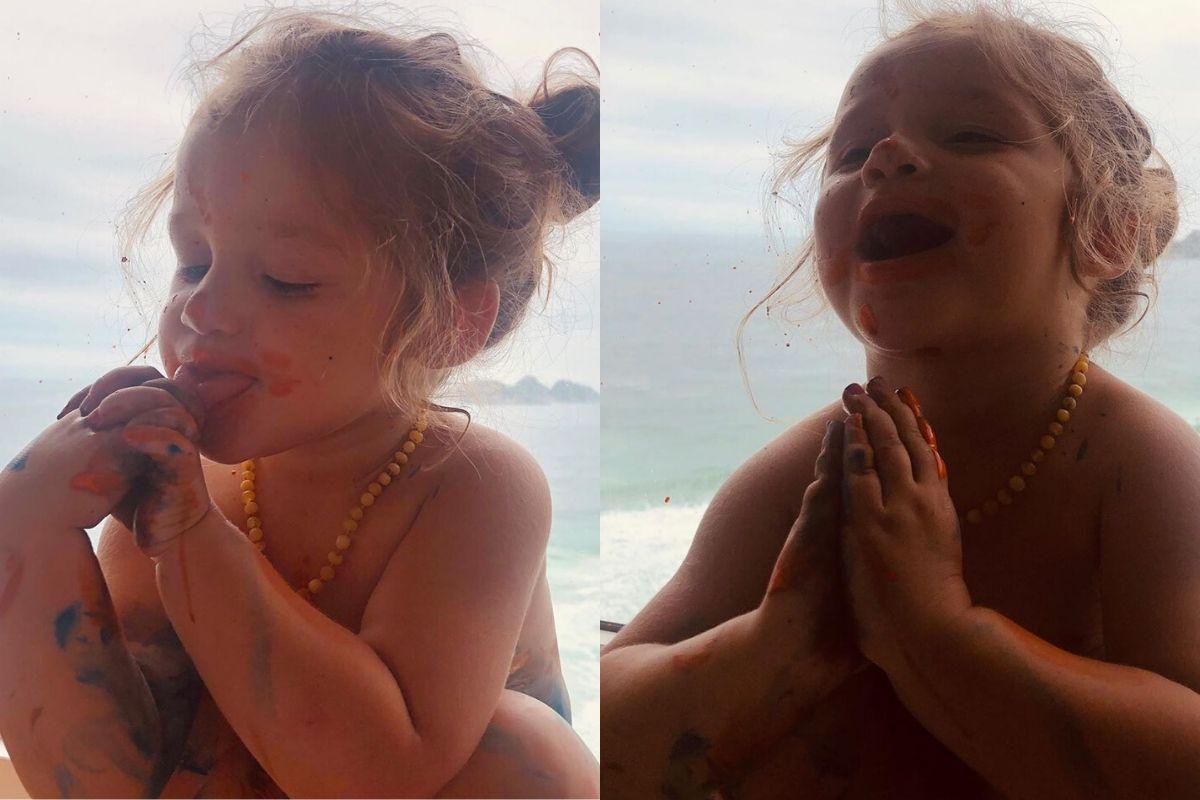 Madalena está com as mãos e braços pintados de guache, mas o que chama a atenção é que a menina uniu as mãos como se estivesse orando e agradecendo. “Filha de peixe, peixinho é. Paz em oração, gratidão! Olha, mãos coloridas!! Será que dá para comer também? Problema com concentração para meditar e gula, quem mais?”, escreveu em legenda.