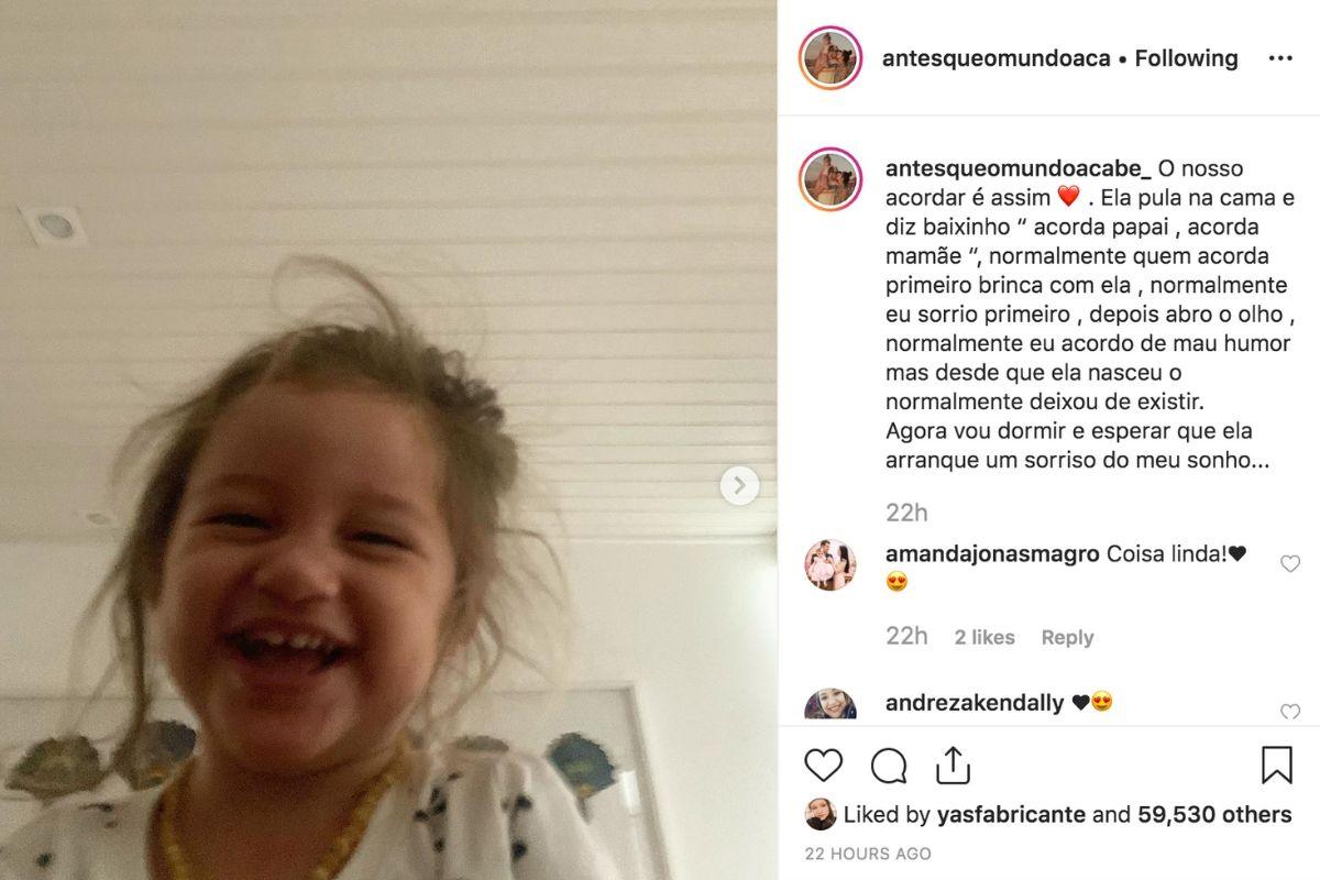 Madalena, como a maioria das crianças, corre todas as manhãs para a cama dos pais para acorda-los e deseja-los um ótimo dia. Em publicação, atriz compartilhou fotos da menina sorridente e ainda revelou que antes acordava mal humorada, mas desde a chegada da filha as coisas mudaram drasticamente. “O nosso acordar é assim. Ela pula na cama e diz baixinho “acorda papai , acorda mamã “, normalmente quem acorda primeiro brinca com ela, normalmente eu sorrio primeiro, depois abro o olho, normalmente eu acordo de mau humor mas desde que ela nasceu o normalmente deixou de existir. Agora vou dormir e esperar que ela arranque um sorriso do meu sonho”, escreveu em legenda.