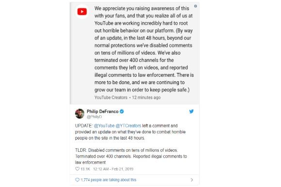 “Nós agradecemos que você se sensibilize com isso junto de seus fãs e que você perceba que todos nós no YouTube estamos trabalhando incrivelmente duro para eliminar comportamentos horrendos da nossa plataforma. (Para atualização, nas últimas 48 horas, além das nossas proteções normais, nós desativamos comentários e dezenas de milhões de vídeos. Nós também excluímos mais de 400 canais pelos comentários que eles deixaram nos vídeos, e reportamos os comentários ilegais para aplicação da lei. Há mais há ser feito, e nós continuamos a aumentar nossa equipe para manter as pessoas seguras.)”.