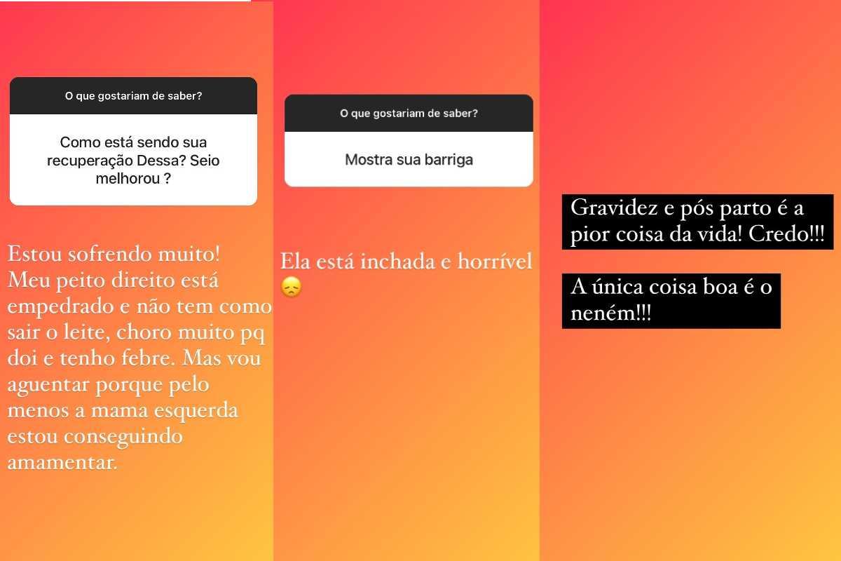 Outra seguidora também quis saber sobre a recuperação de Andressa e ela contou: “Estou sofrendo muito! Meu peito direito está empedrado e não tem como sair o leite, choro muito, dói e tenho febre. Mas vou aguentar porque pelo menos a mama esquerda estou conseguindo amamentar”.