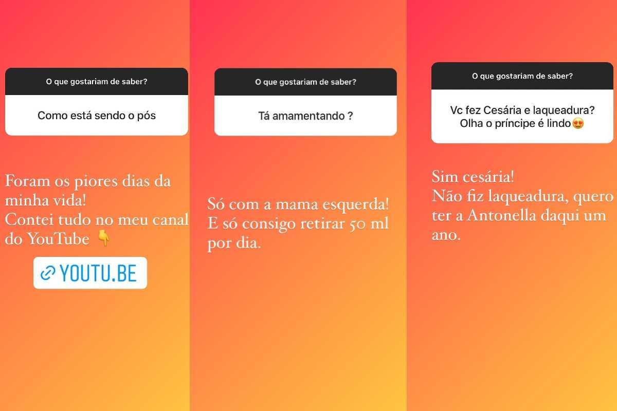 Sobre o pós-parto, ela desabafou: “Foram os piores dias da minha vida”. Em outra oportunidade, ela já havia comentado sobre as dificuldades, principalmente em relação à amamentação. Questionada sobre o parto que realizou e se fez laqueadura, ela afirmou: “Cesárea, não fiz laqueadura. Quero ter a Antonella daqui 1 ano”.