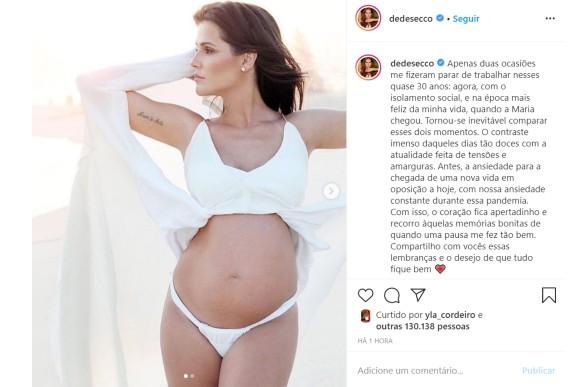 “Apenas duas ocasiões me fizeram parar de trabalhar nesses quase 30 anos: agora, com o isolamento social, e na época mais feliz da minha vida, quando a Maria chegou. Tornou-se inevitável comparar esses dois momentos. O contraste imenso daqueles dias tão doces com a atualidade feita de tensões e amarguras. Antes, a ansiedade para a chegada de uma nova vida em oposição a hoje, com nossa ansiedade constante durante essa pandemia. Com isso, o coração fica apertadinho e recorro àquelas memórias bonitas de quando uma pausa me fez tão bem. Compartilho com vocês essas lembranças e o desejo de que tudo fique bem 💗”, escreveu na legenda.