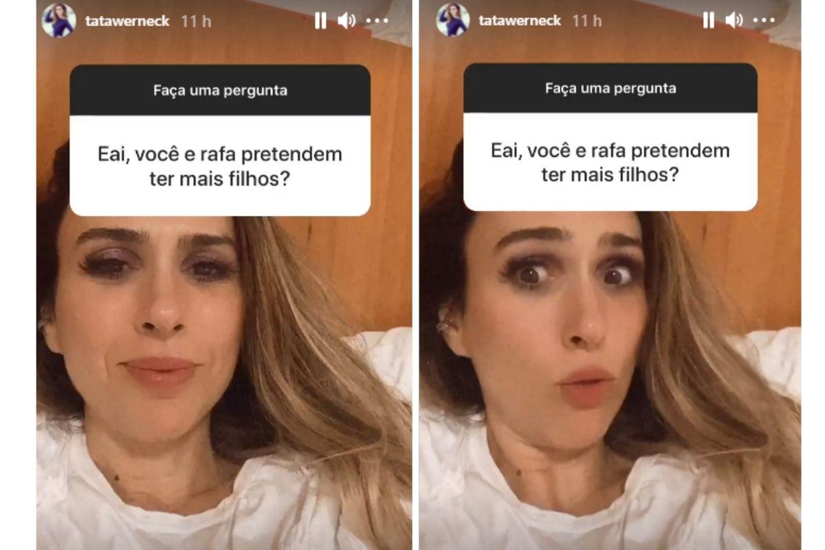 Um internauta, então, questionou a respeito da possibilidade dela ter mais filhos. A comediante é mãe de Clara Maria, de 1 ano, fruto do relacionamento com Rafa Vitti. Tatá fez questão de responder a pergunta, compartilhando-a nos Stories do Instagram.