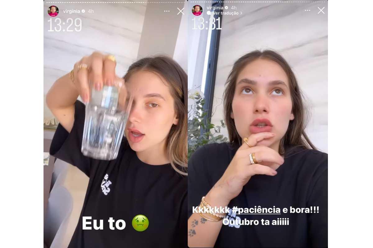 Na sequência, ela compartilhou: “O que está me salvando aqui é água com gás. Minha mãe pediu feijoada, essa feijoada é a melhor do mundo, mas eu tô tipo assim” e imitou uma ânsia. Virginia ainda relembrou a primeira gestação.