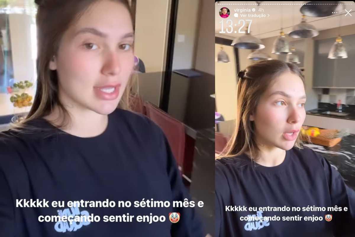“Galera, deixa eu falar um negócio para vocês. Você acredita? Eu entro no sétimo mês hoje. Comecei a sentir enjoo nessa altura do campeonato. Vocês acreditam num trem desse?”, disse Virginia, além de escrever: “Eu entrando no sétimo mês e começando a sentir enjoo”.