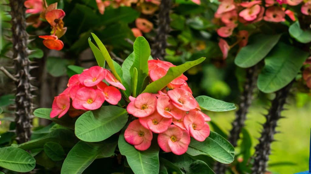 Conhecida por seus espinhos, a coroa-de-cristo (Euphorbia milii) é uma excelente escolha para cercas vivas que necessitam tanto de ornamentação quanto de uma barreira de proteção. Esta planta resistente e perene não apenas suporta seca como também floresce regularmente, oferecendo um toque colorido ao jardim. Um cuidado especial deve ser tomado ao podar devido ao látex leitoso que pode ser irritante.